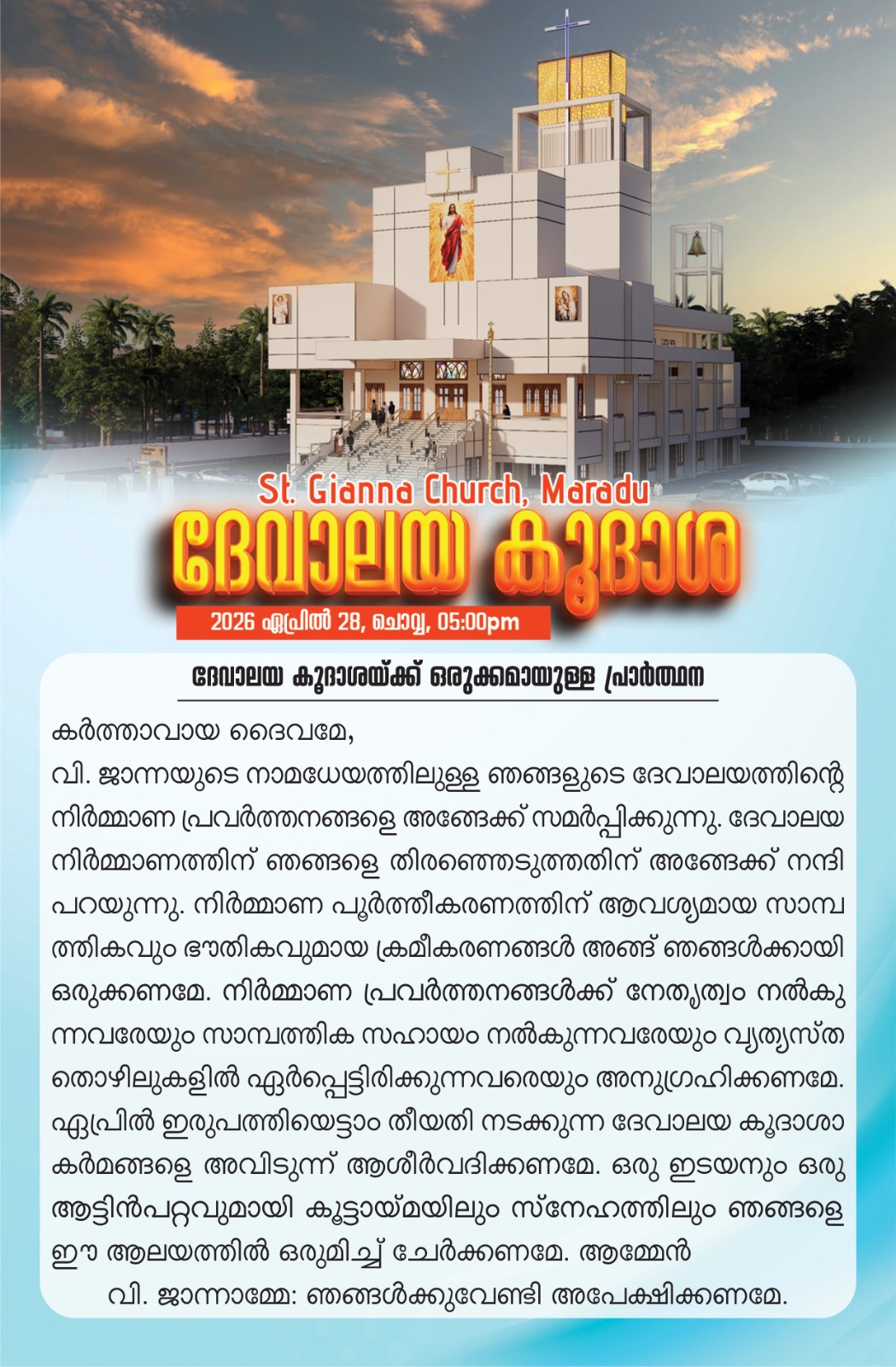 Nestled amidst the calm and tranquil surroundings of nature, but only an arm’s stretch from the hustle and bustle of the busy NH 47 in Maradu is St Gianna’s Church, Asia’s first church dedicated to St Gianna Beretta Molla. The church started with bare minimum facilities and only about 175 families constituted into 6 family units, who were till then part of St James Church Poonithura and St Mary’s Church Thrippunithura. Most of the parishioners were from the various parts of the state settled here in view of employment and livelihood. The church was blessed on 27th January 2007 by Mar Thomas Chakiath, then Auxiliary Bishop of Ernakulam.